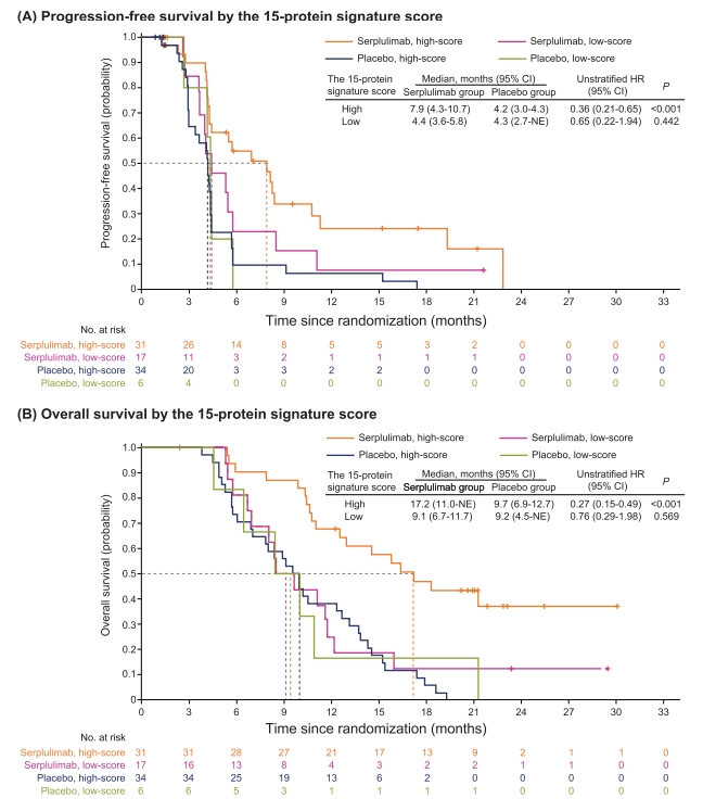 至2022年6月13日数据截止时,在意向治疗人群中,斯鲁利单抗组和安慰剂组的中位OS分别为15.8个月和11.1个月(HR 0.62;95% CI: 0.50-0.76;描述性P < 0.001)。顺利获得比较斯鲁利单抗组中达到客观缓解和未达客观缓解的患者的血清蛋白质组,鉴定出181个DEPs,并由此构建了基于15个蛋白表达水平的分子标志物组合(15-蛋白标志物组合)。研究结果显示,在斯鲁利单抗组中,较高的15-蛋白标志物组合评分与更长的OS和PFS显著相关(见下图)。此外,携带RB1基因突变或Notch通路突变的患者,与携带对应的野生型基因的患者相比,取得ORR、OS或PFS改善。基线中性粒细胞与淋巴细胞比值(NLR)和乳酸脱氢酶(LDH)水平则是ES-SCLC患者的独立预后因素。
