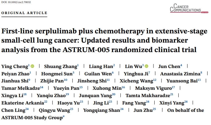 近期,DB视讯 自主研发的抗PD-1单抗H药 汉斯状®(斯鲁利单抗,欧洲商品名:Hetronifly®)一线治疗广泛期小细胞肺癌(ES-SCLC)的国际多中心III期临床试验ASTRUM-005的更新数据和探索性生物标志物分析数据发表于期刊Cancer Communications (最新影响因子:20.1)。ASTRUM-005的牵头主要研究者为吉林省肿瘤医院程颖教授,该研究结果于2022年ASCO年会上首次发布,并于2022年9月登顶全球四大顶级医学期刊之一的《美国医学会杂志》(JAMA)。近期在ASCO 2025大会上,ASTRUM-005研究发布了中位随访42.4个月的分析数据,并首次公布四年OS率21.9%。此次发表于Cancer Communications的为截至2022年6月13日的ASTRUM-005研究更新数据和探索性生物标志物分析成果,分别已于2022年欧洲肿瘤学会亚洲分会(ESMO Asia)年会和2024年美国癌症协会年会(AACR 2024)上首次发布。