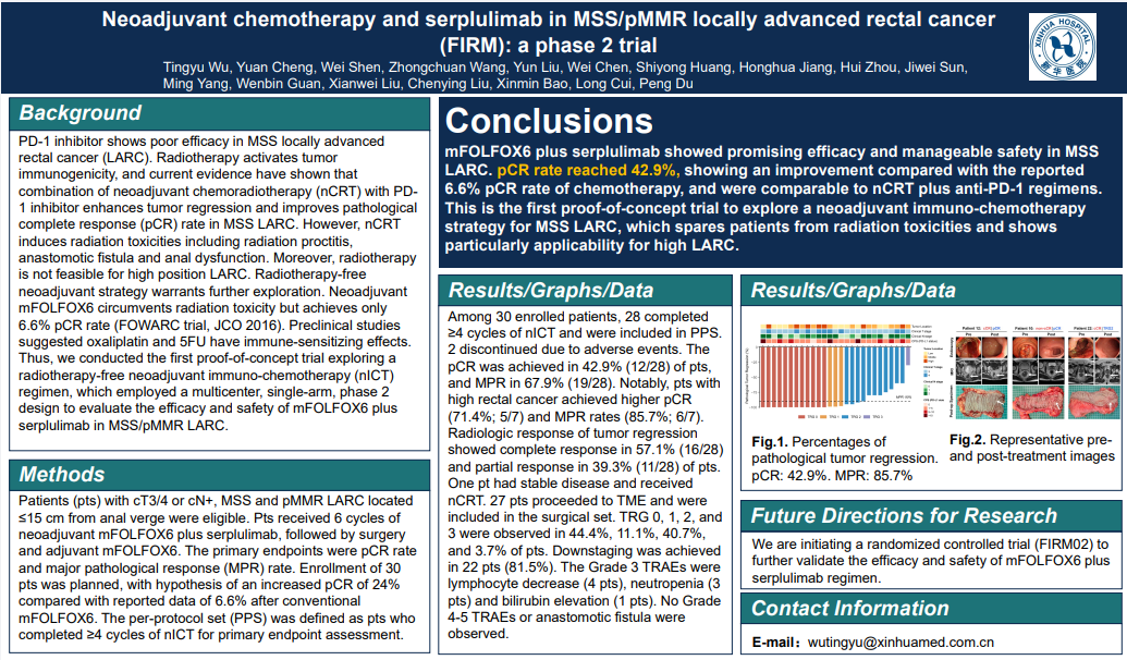 试验设计:入组cT3/4或cN+,距肛缘≤15 cm,MSS/pMMR的 LARC患者(pts),接受6个周期的新辅助mFOLFOX6和斯鲁利单抗,随后进行手术和辅助mFOLFOX6。主要终点为pCR率和主要病理反应(MPR)率